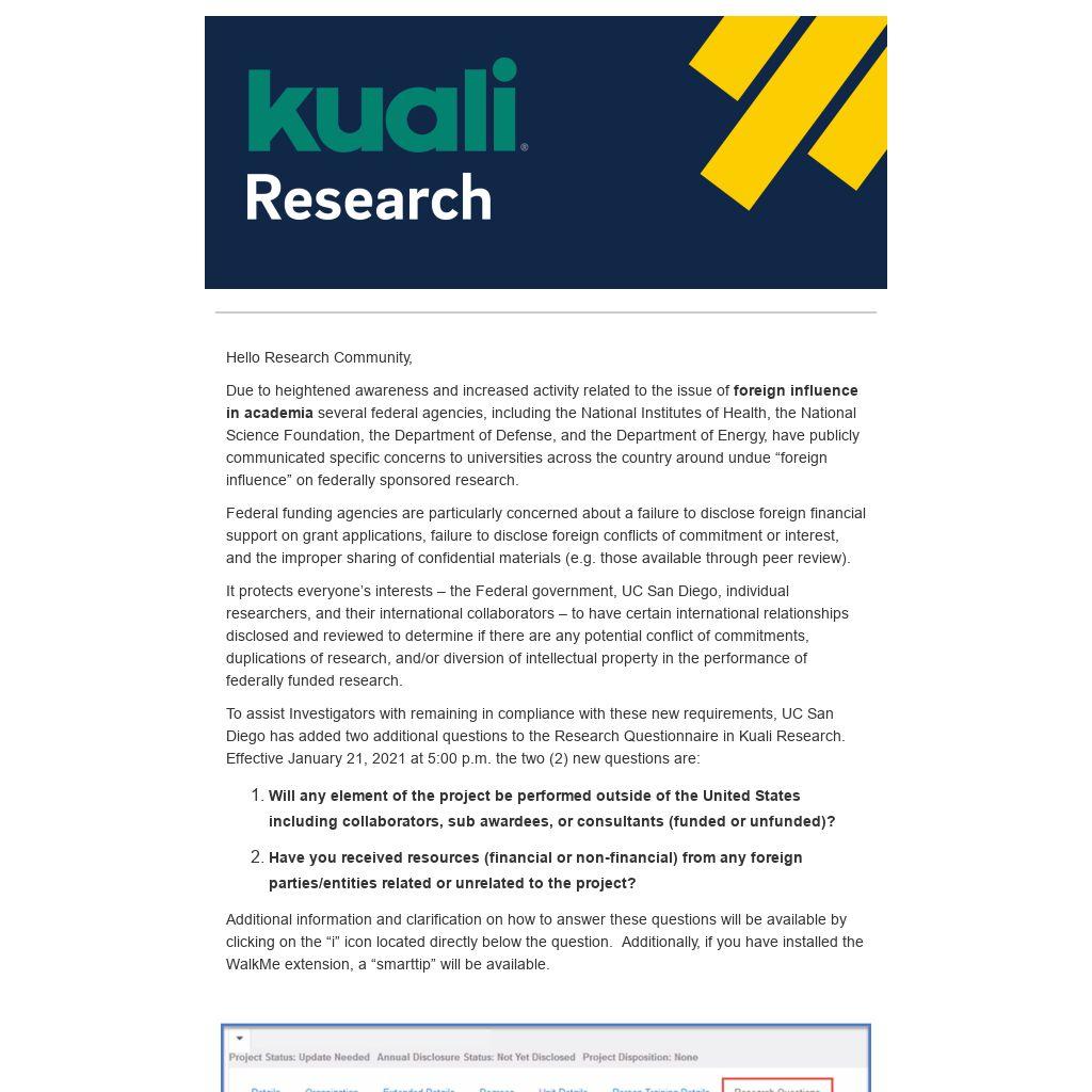 To assist Investigators with remaining in compliance with these new requirements, UC San Diego has added two additional questions to the Research Questionnaire in Kuali Research. Effective January 21, 2021 at 5:00 p.m. the two (2) new questions are: