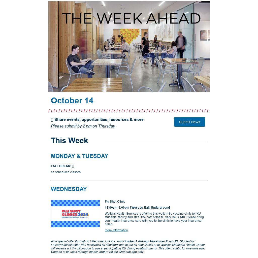 As a special offer throughĀ KU Memorial Unions, from October 1 through November 8, any KU Student or Faculty/Staff member who receives a flu shot from one of our flu shot clinics or at Watkins Memorial Health Center will receive a 15% off coupon to use at participating KU dining establishments. This offer is valid for one-time use. Coupon to be used through mobile orders via the Grubhub app only.