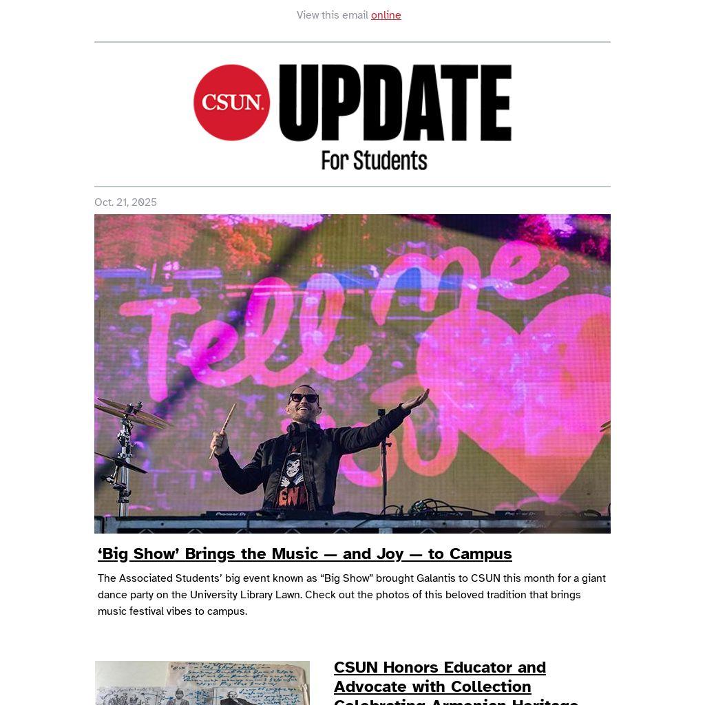 Please take a few minutes to share your thoughts on CSUN Update—what you love, what you’d like to see more of and how we can make our newsletter even better. Your feedback will help us deliver stories, events and news that matter most to the CSUN community.