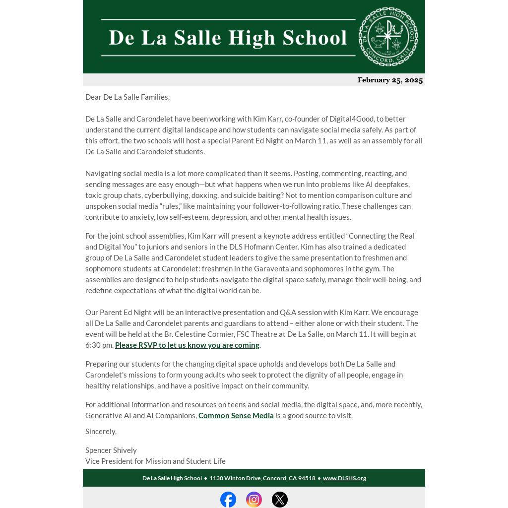 De La Salle and Carondelet have been working with Kim Karr, co-founder of Digital4Good, to better understand the current digital landscape and how students can navigate social media safely. As part of this effort, the two schools will host a special Parent Ed Night on March 11, as well as an assembly for all De La Salle and Carondelet students.
