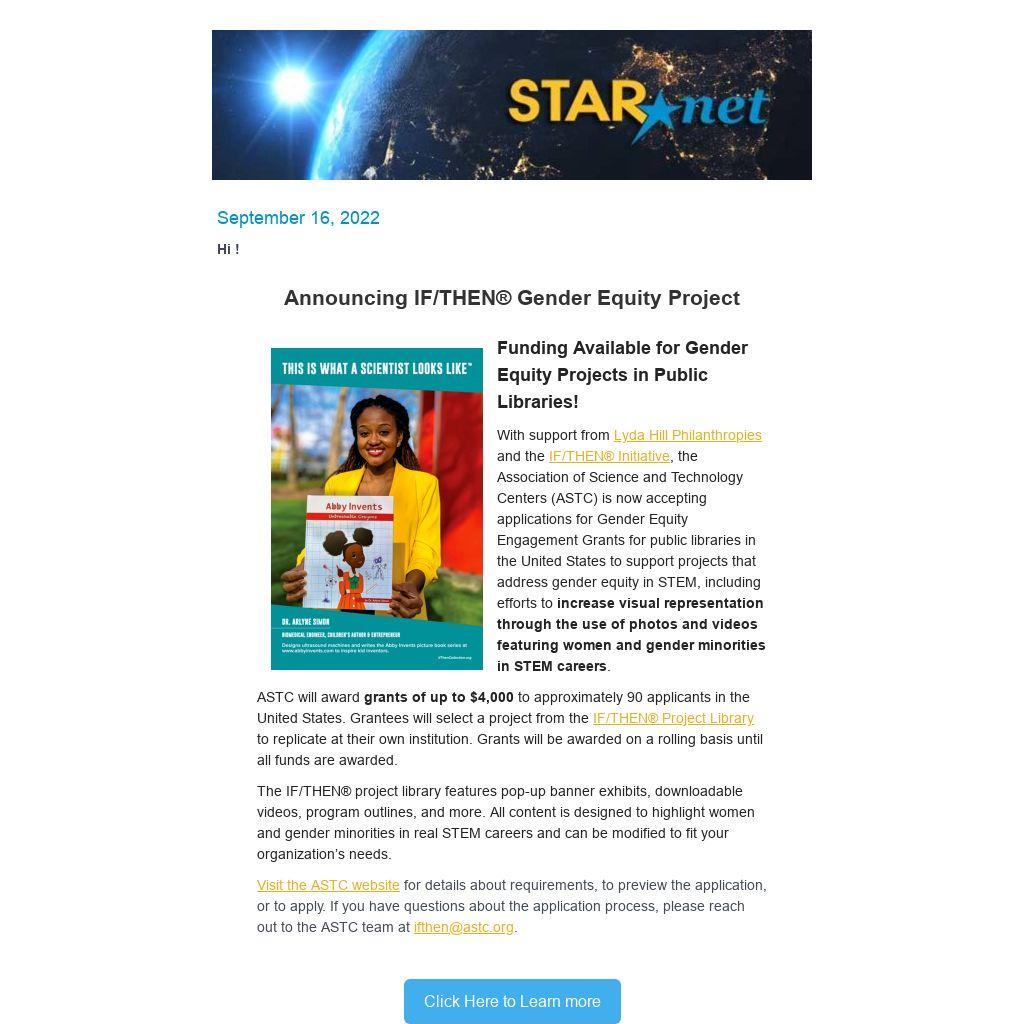 The STAR Library Network (STAR Net) is a hands-on learning network for libraries and their communities across the country. STAR Net focuses on helping library professionals build their STEM skills by providing “science-technology activities and resources” (STAR) and training to use those resources.