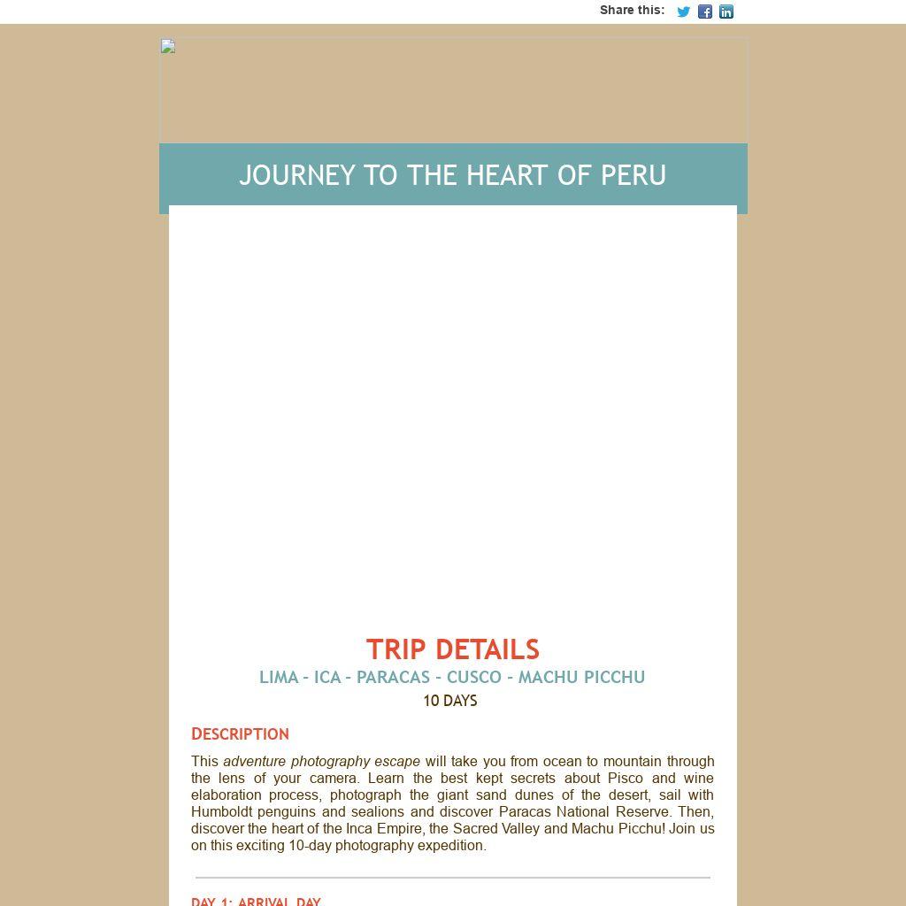 | DESCRIPTION This adventure photography escape will take you from ocean to mountain through the lens of your camera. Learn the best kept secrets about Pisco and wine elaboration process, photograph the giant sand dunes of the desert, sail with Humboldt penguins and sealions and discover Paracas National Reserve. Then, discover the heart of the Inca Empire, the Sacred Valley and Machu Picchu! Join us on this exciting 10-day photography expedition.