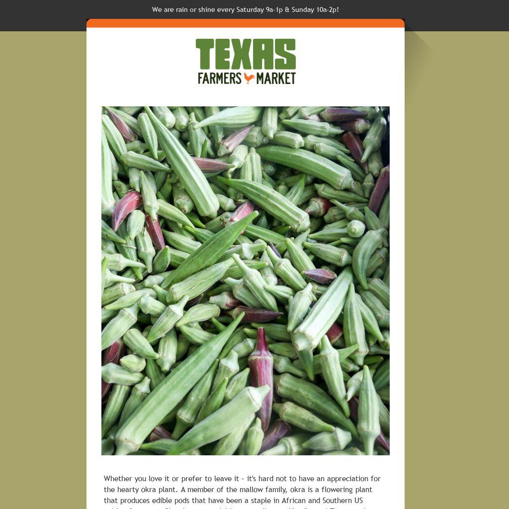 Arugula * Basil (Thai, lemon, Genovese) * Beans (Asian long beans) * Beets (golden, red) * Bok choy * Carrots * Chard * Chicory * Cucumber (Armenian, pickling) * Eggplant (black beauty, purple, graffiti) * Figs * Garlic * Lemongrass * Lettuce * Malabar spinach * Melons (watermelon, cantaloupe, canary, Korean, honeydew) * Okra * Onions (yellow, white, red, 1015) * Peaches * Peas * Peppers (sweet, bell, sweet Hungarian wax, jalapeno, banana) * Potatoes (Yukon, red, sweet) * Prickly pear * Squash (blossoms, butternut, acorn, spaghetti, delicata, yellow, zucchini, pattypan) * Sweet potato greens * Tomatillos * Tomatoes (Juliet, chocolate, golden cherry, heirloom, red) * Turnip greens * Watermelon Radish