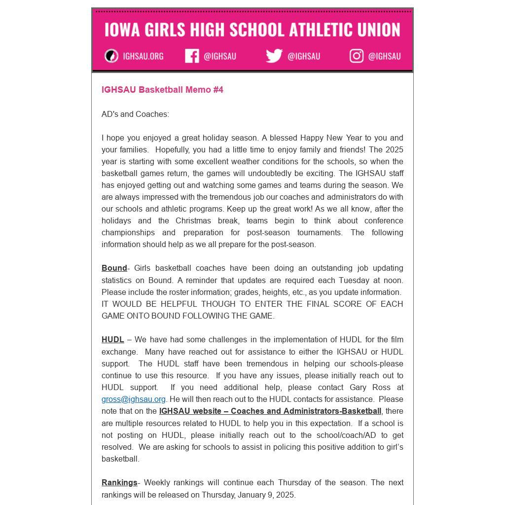 I hope you enjoyed a great holiday season. A blessed Happy New Year to you and your families. Hopefully, you had a little time to enjoy family and friends! The 2025 year is starting with some excellent weather conditions for the schools, so when the basketball games return, the games will undoubtedly be exciting. The IGHSAU staff has enjoyed getting out and watching some games and teams during the season. We are always impressed with the tremendous job our coaches and administrators do with our schools and athletic programs. Keep up the great work! As we all know, after the holidays and the Christmas break, teams begin to think about conference championships and preparation for post-season tournaments. The following information should help as we all prepare for the post-season.