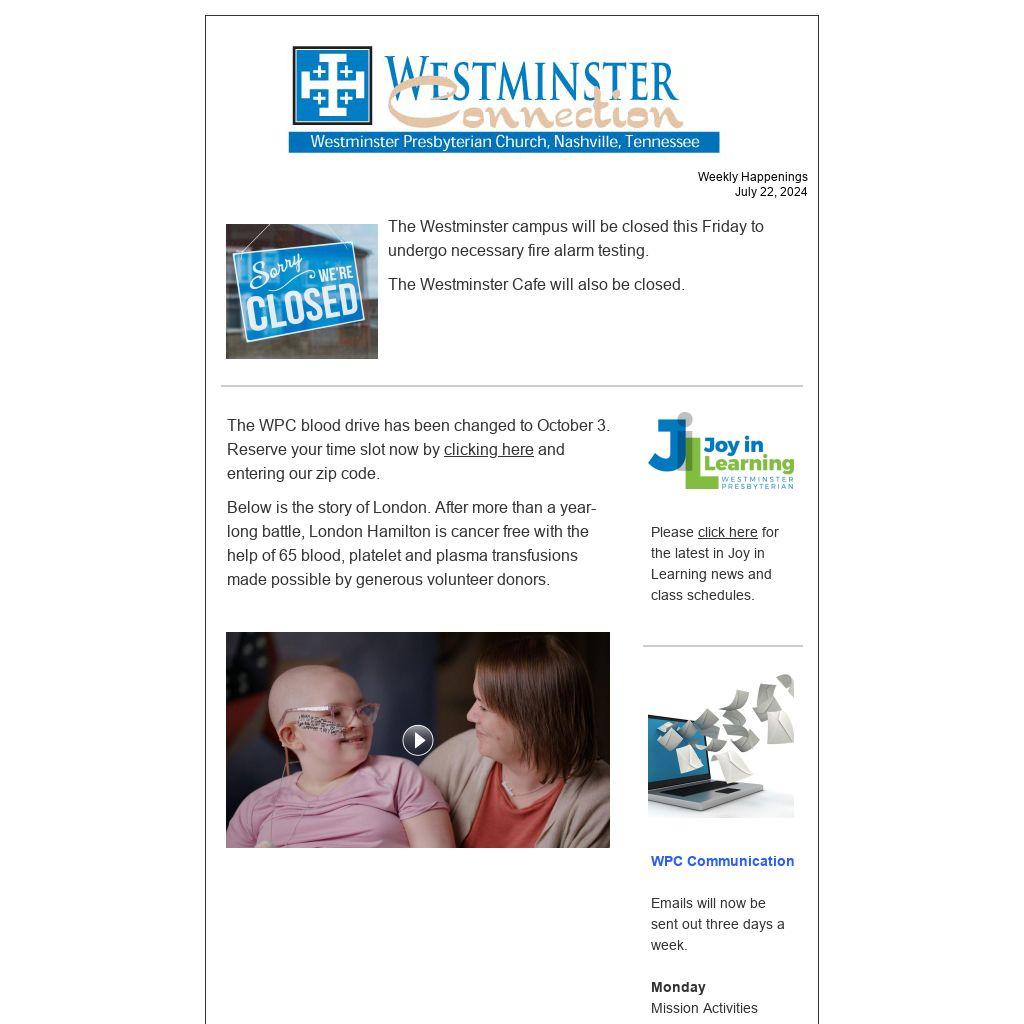 The Westminster campus will be closed this Friday to undergo necessary fire alarm testing.