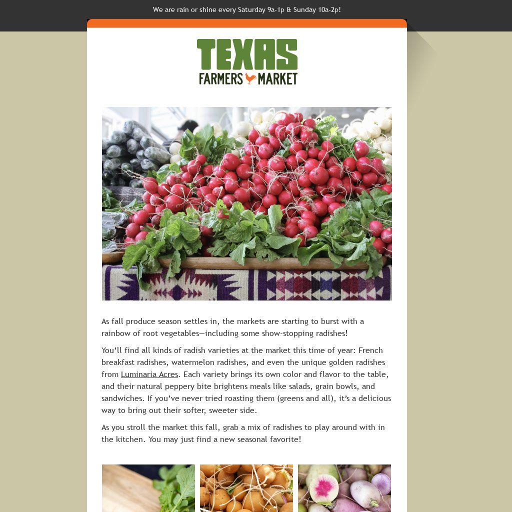 Arugula • Basil (Holy, Sweet) • Beans (Asian, Purple Long, Green) • Bok Choy • Beets • Broccoli • Cabbage (Napa, Green) • Carrots • Chard • Cilantro • Collard Greens • Cucumbers • Dill • Eggplant • Garlic Chives • Green Onions • Herbs • Kale (Red Russian, Curly, Lacinato) • Lettuce • Moringa • Mustard Greens • Okra • Onions (Yellow, Red, White) • Parsley • Pears • Pecans • Peppers (Sweet, Shishito, Hot, Bell, Jalapeno, Lunchbox) • Persimmons • Potatoes • Pumpkins • Radishes (Daikon, Red, Watermelon) • Spinach • Squash (Zucchini, Yellow, Spaghetti, Butternut, Acorn) • Sunchokes • Sweet Potatoes • Tomatoes • Turnips