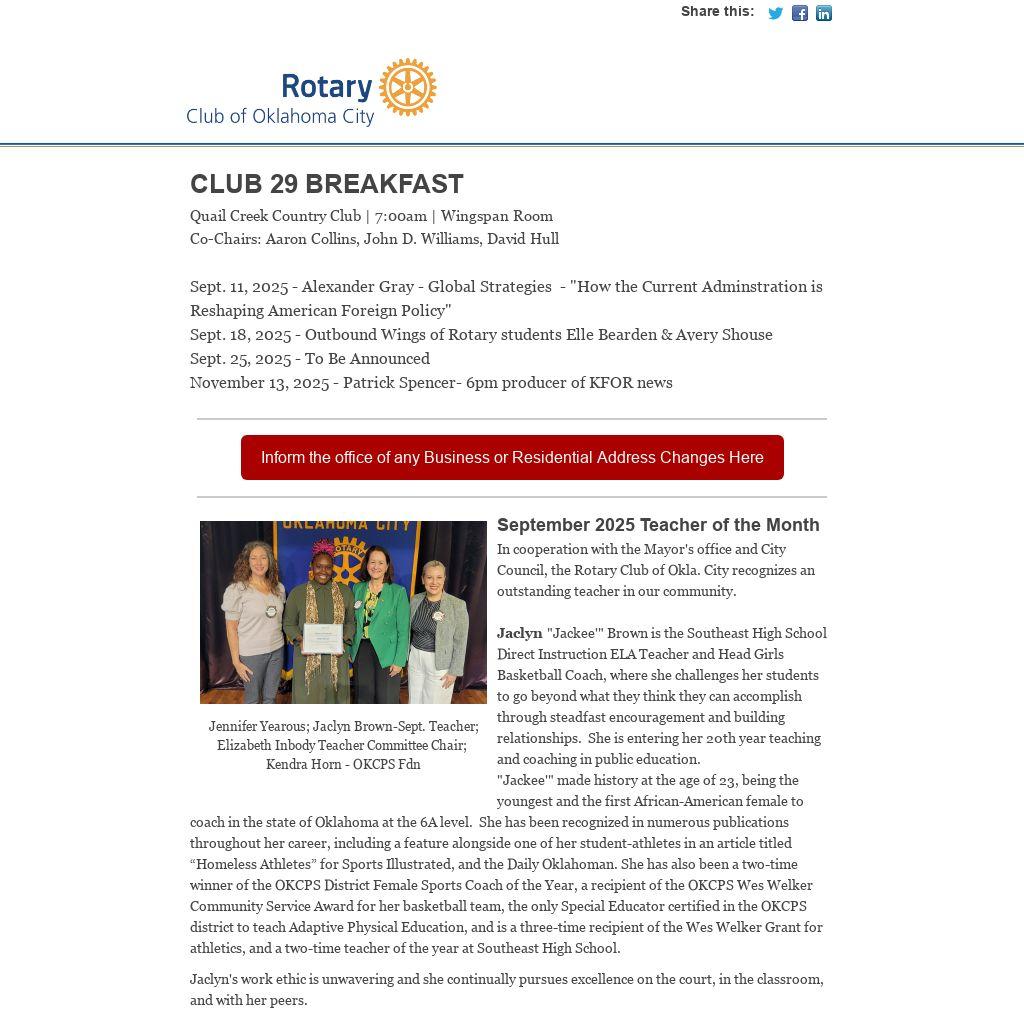Rotary Club 29 has an online membership directory which contains current content information for all club members. The link to access the Club 29 directory can be found at the top of  the home page of  okcrotary.club or by clicking here.