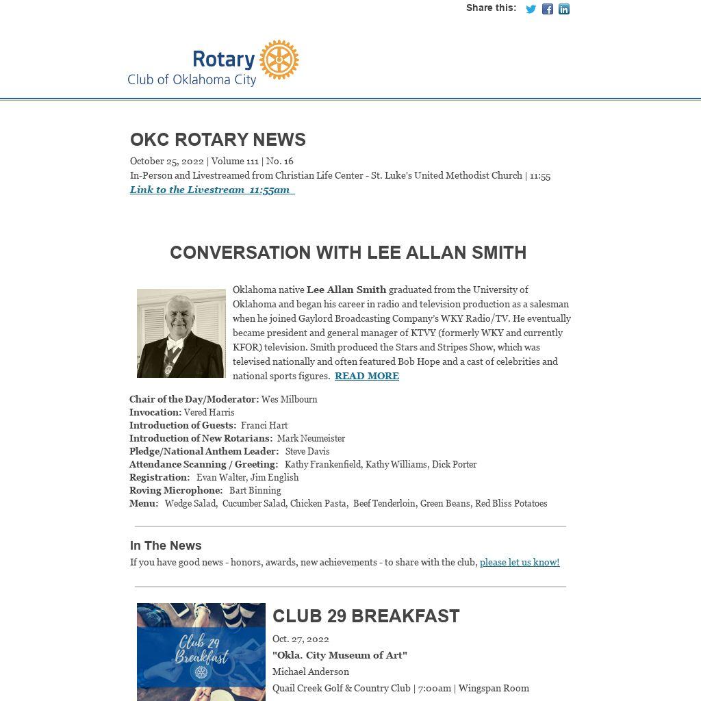 OKC Rotary NewsOctober 25, 2022 | Volume 111 | No. 16 In-Person and Livestreamed from Christian Life Center - St. Luke's United Methodist Church | 11:55