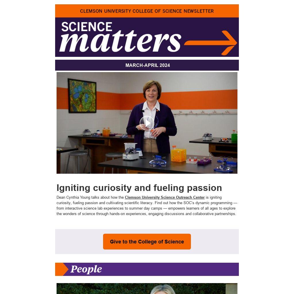 Clemson University Alumni Spring Break on March 22 from noon to 1:30 p.m. at Tiger Town Tavern, 368 College Avenue, Clemson. Come gather with some fellow SCIENCE Tigers, College of Science leadership, faculty and faculty emeriti. Register for the lunch