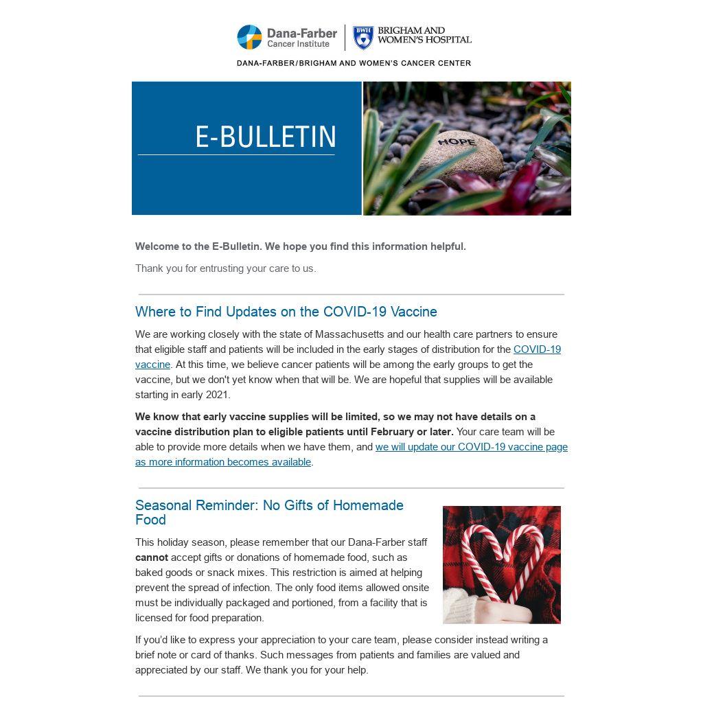 This holiday season, please remember that our Dana-Farber staff cannot accept gifts or donations of homemade food, such as baked goods or snack mixes. This restriction is aimed at helping prevent the spread of infection. The only food items allowed onsite must be individually packaged and portioned, from a facility that is licensed for food preparation.