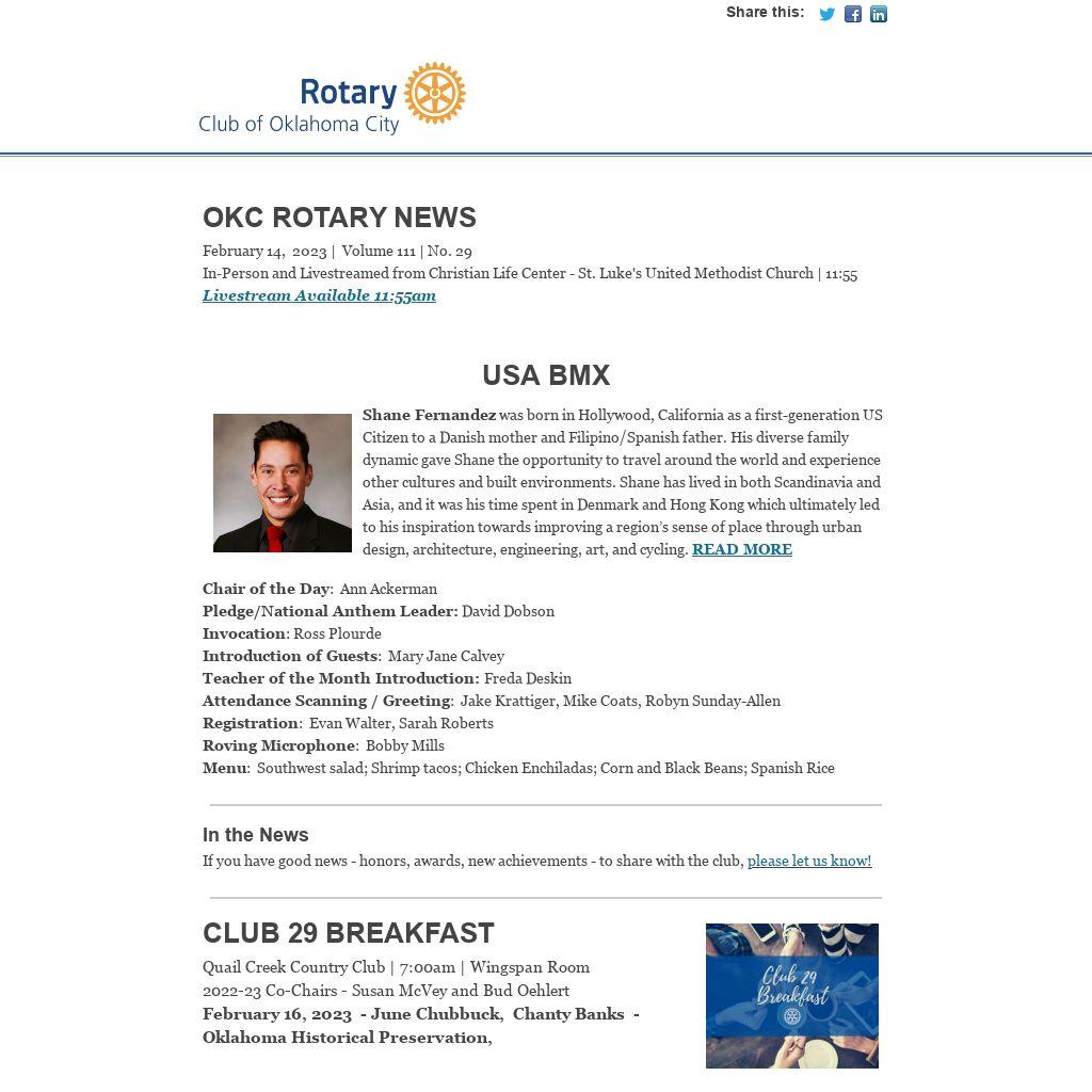 OKC Rotary NewsFebruary 14, 2023 | Volume 111 | No. 29In-Person and Livestreamed from Christian Life Center - St. Luke's United Methodist Church | 11:55