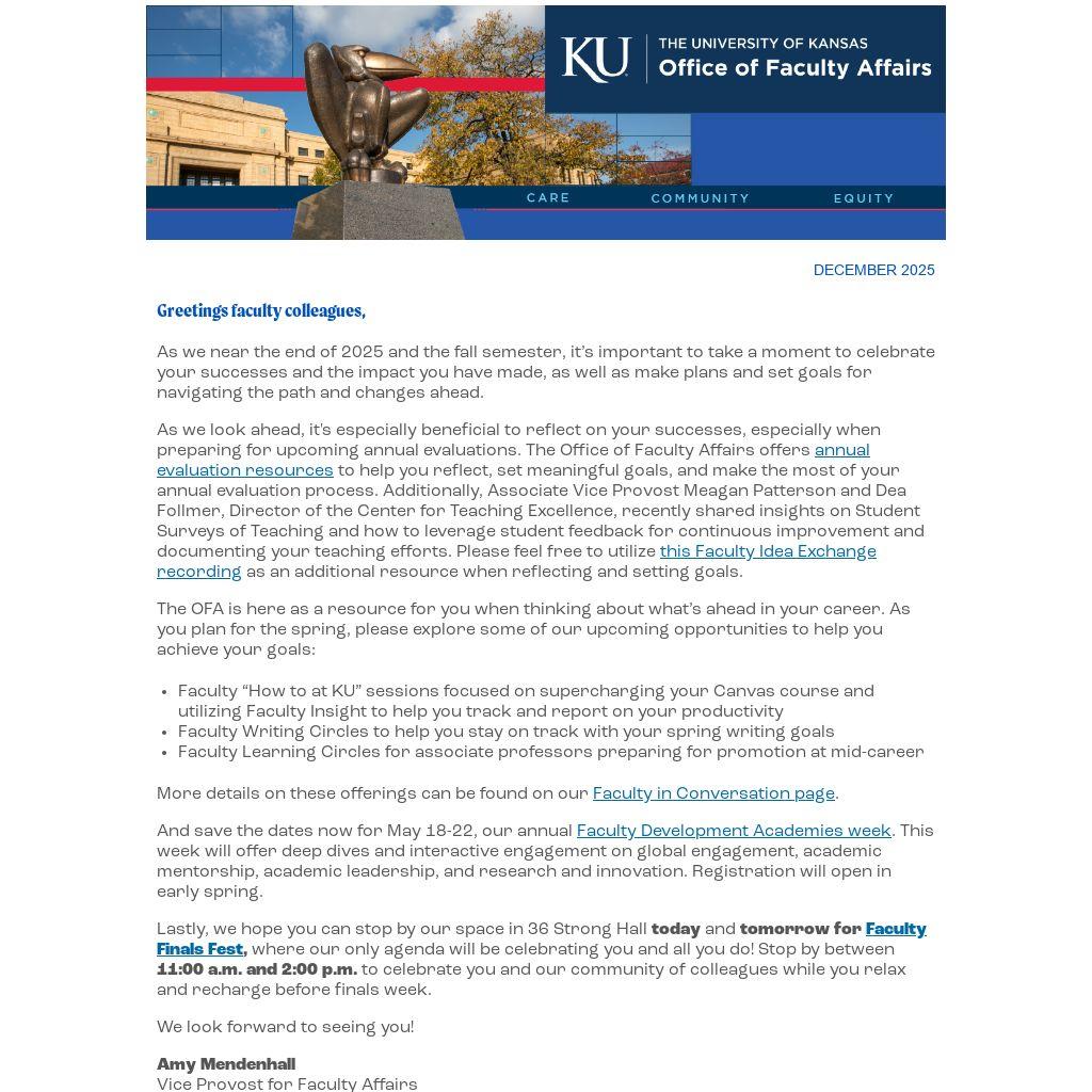 Lastly, we hope you can stop by our space in 36 Strong Hall today and tomorrow for Faculty Finals Fest, where our only agenda will be celebrating you and all you do! Stop by between 11:00 a.m. and 2:00 p.m. to celebrate you and our community of colleagues while you relax and recharge before finals week.