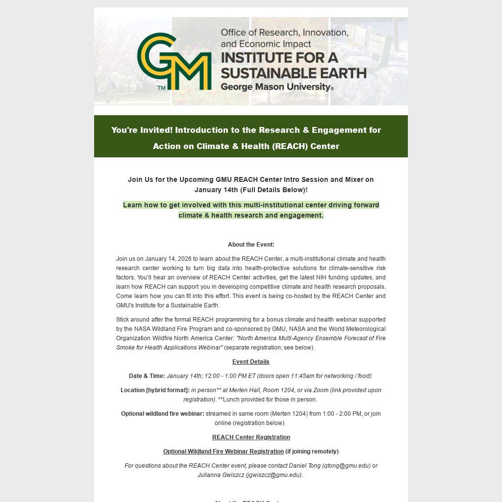 Join us on January 14, 2026 to learn about the REACH Center, a multi-institutional climate and health research center working to turn big data into health-protective solutions for climate-sensitive risk factors. You’ll hear an overview of REACH Center activities, get the latest NIH funding updates, and learn how REACH can support you in developing competitive climate and health research proposals. Come learn how you can fit into this effort. This event is being co-hosted by the REACH Center and GMU's Institute for a Sustainable Earth.