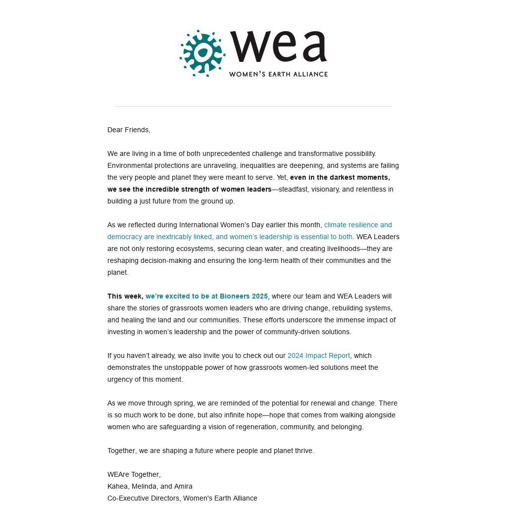 This week, we’re excited to be at Bioneers 2025, where our team and WEA Leaders will share the stories of grassroots women leaders who are driving change, rebuilding systems, and healing the land and our communities. These efforts underscore the immense impact of investing in women’s leadership and the power of community-driven solutions.