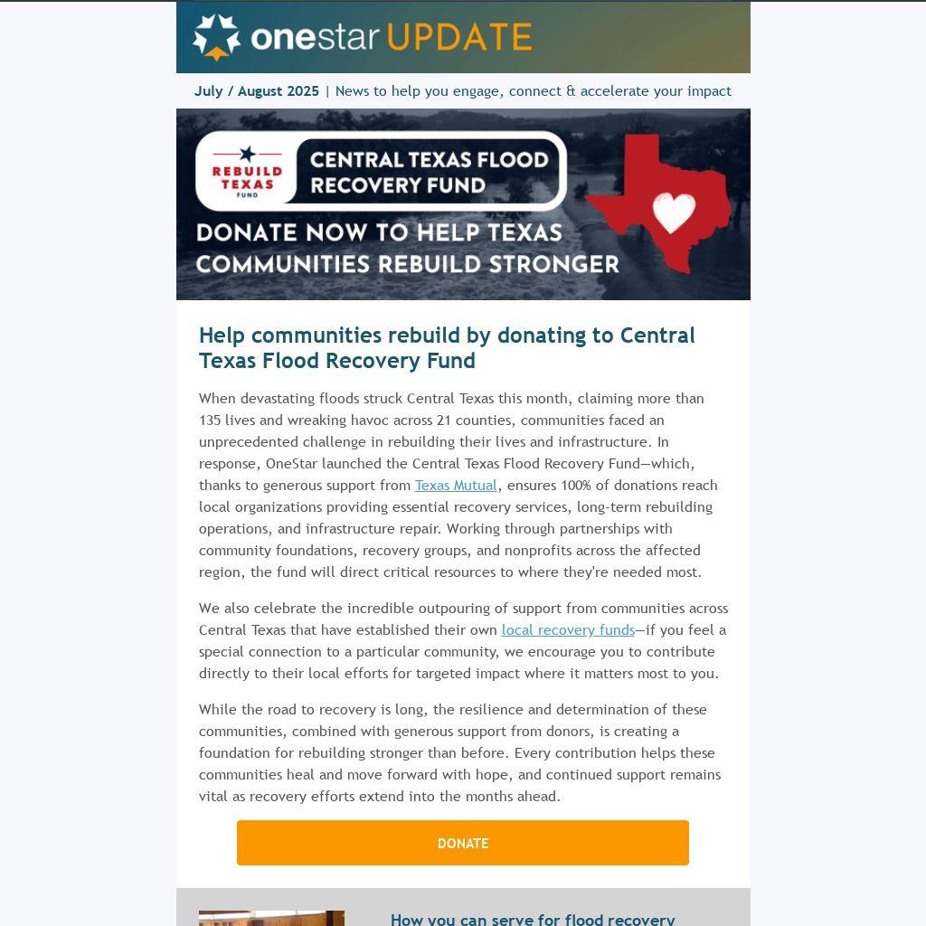 When devastating floods struck Central Texas this month, claiming more than 135 lives and wreaking havoc across 21 counties, communities faced an unprecedented challenge in rebuilding their lives and infrastructure. In response, OneStar launched the Central Texas Flood Recovery Fund—which, thanks to generous support from Texas Mutual, ensures 100% of donations reach local organizations providing essential recovery services, long-term rebuilding operations, and infrastructure repair. Working through partnerships with community foundations, recovery groups, and nonprofits across the affected region, the fund will direct critical resources to where they're needed most.
