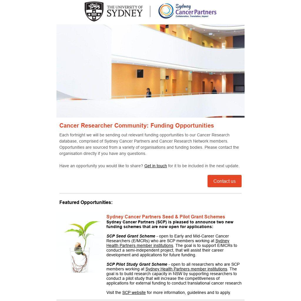 SCP Pilot Study Grant Scheme - open to all researchers who are SCP members working at Sydney Health Partners member institutions. The goal is to build research capacity in NSW by supporting researchers to conduct a pilot study that will increase the competitiveness of applications for external funding to conduct translational cancer research