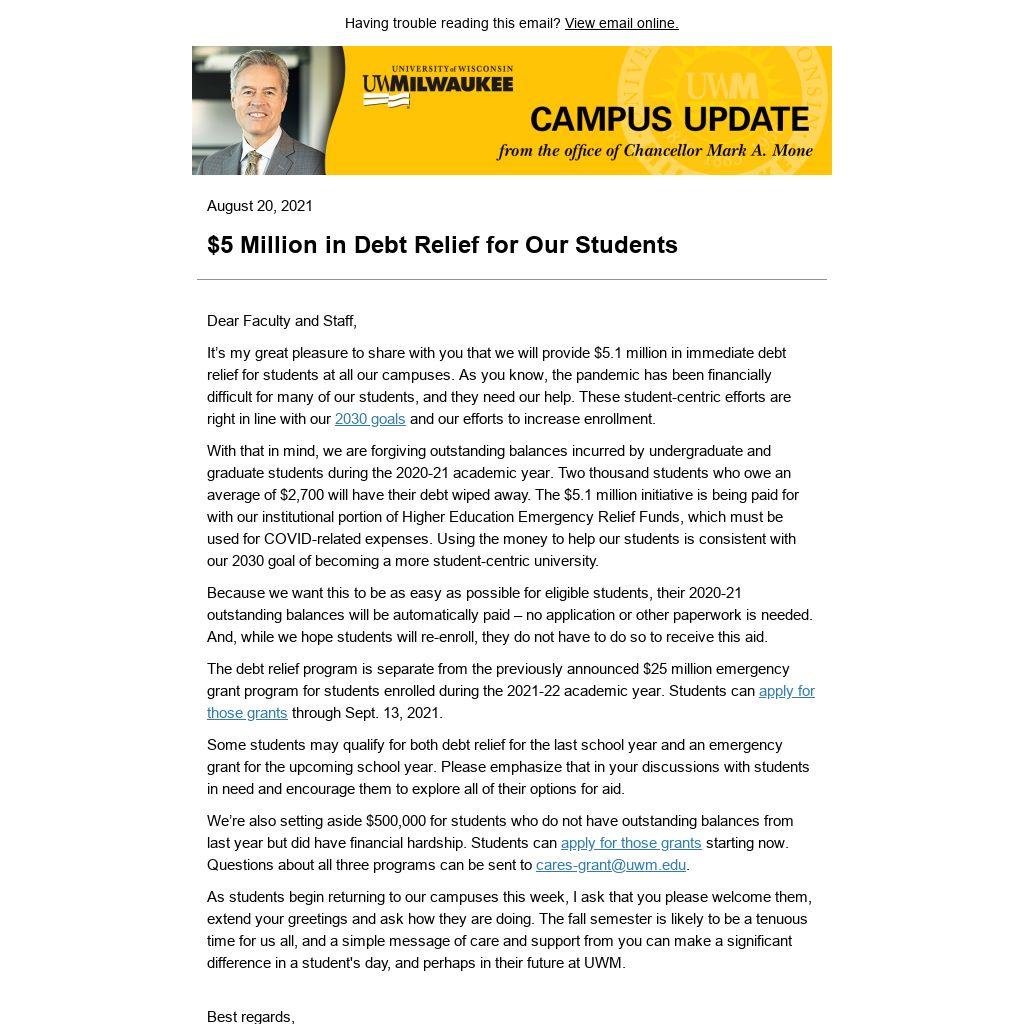 We’re also setting aside $500,000 for students who do not have outstanding balances from last year but did have financial hardship. Students can apply for those grants starting now. Questions about all three programs can be sent to cares-grant@uwm.edu.