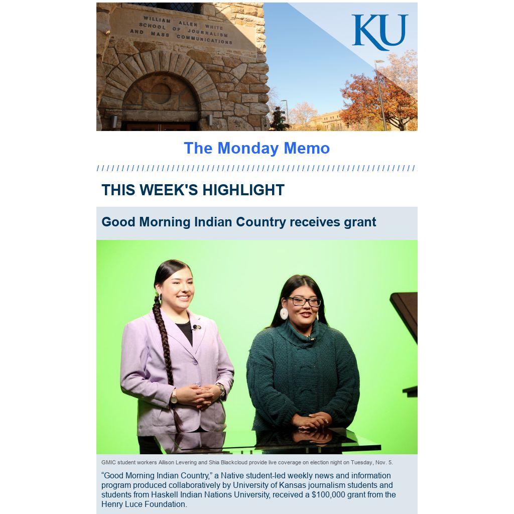 “Good Morning Indian Country,” a Native student-led weekly news and information program produced collaboratively by University of Kansas journalism students and students from Haskell Indian Nations University, received a $100,000 grant from the Henry Luce Foundation.