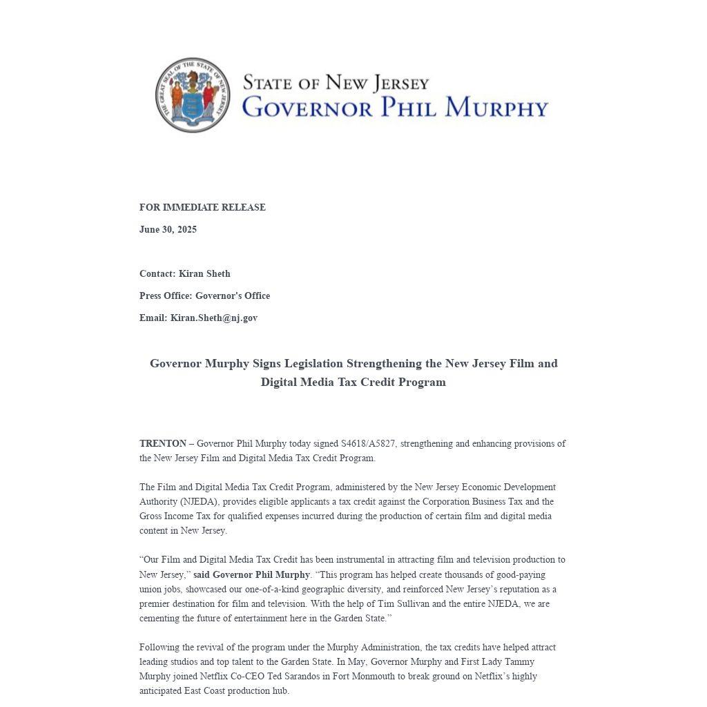 TRENTON – Governor Phil Murphy today signed S4618/A5827, strengthening and enhancing provisions of the New Jersey Film and Digital Media Tax Credit Program.