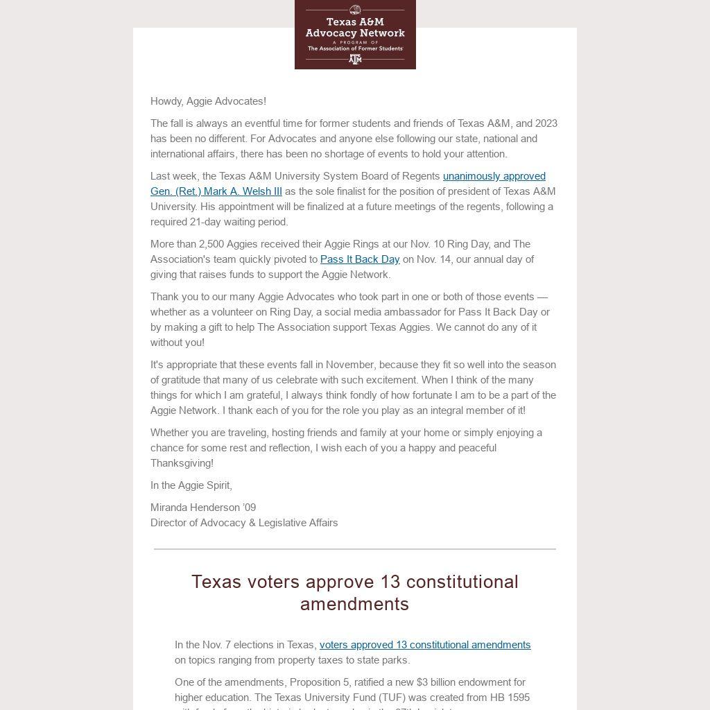 Scott will be officially confirmed in this new position when the Virginia General Assembly convenes in Jan. 2024. He will become the first African-American speaker of the House of Delegates; as well as the first Aggie to serve as speaker of a state legislature outside of Texas!