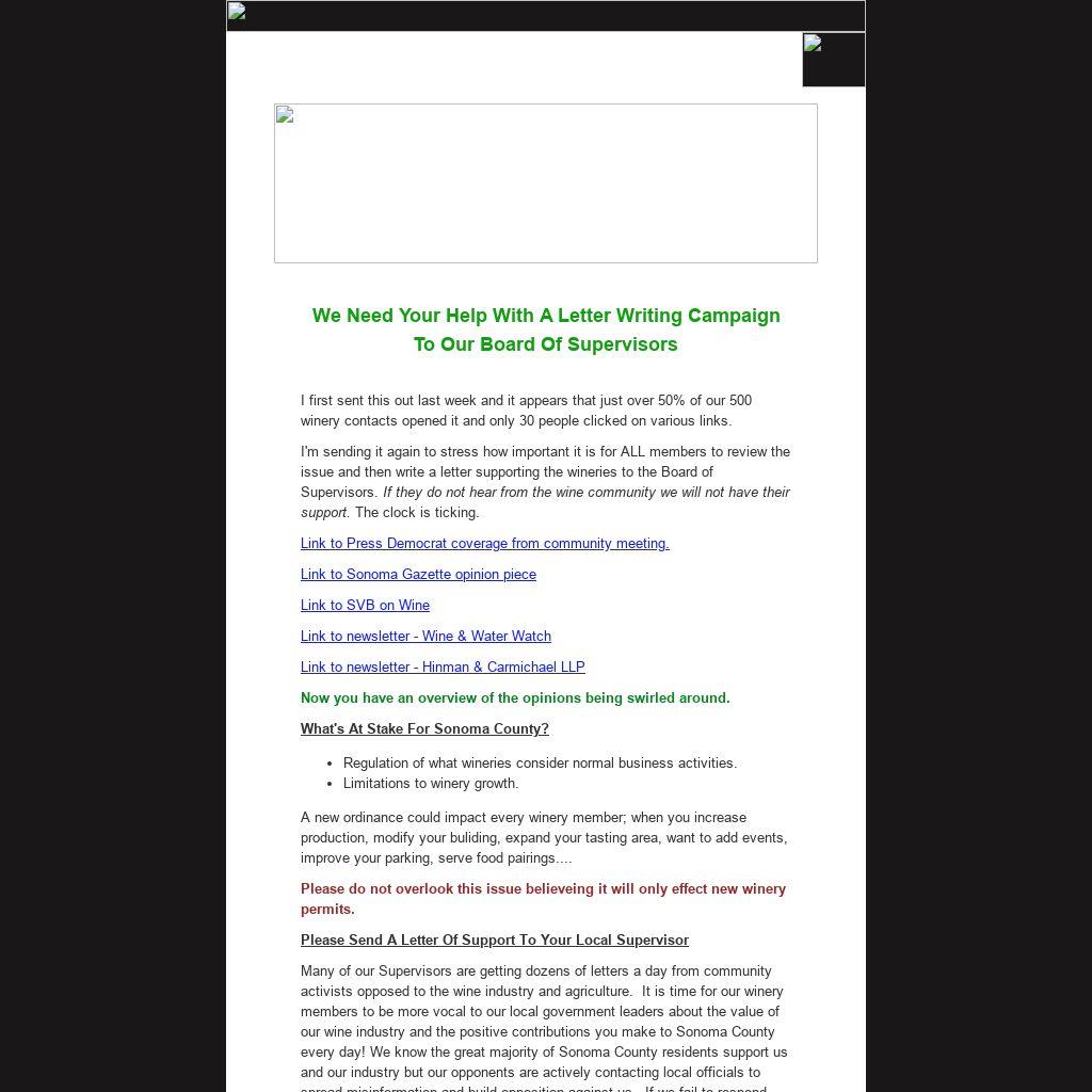 Many of our Supervisors are getting dozens of letters a day from community activists opposed to the wine industry and agriculture. It is time for our winery members to be more vocal to our local government leaders about the value of our wine industry and the positive contributions you make to Sonoma County every day! We know the great majority of Sonoma County residents support us and our industry but our opponents are actively contacting local officials to spread misinformation and build opposition against us. If we fail to respond and inform, we run the risk of having their lies become facts in the eyes of key decision makers. In this critical time and debate over the preservation of agriculture and winery event permitting in our county, it's crucial that our local government leaders here from us.