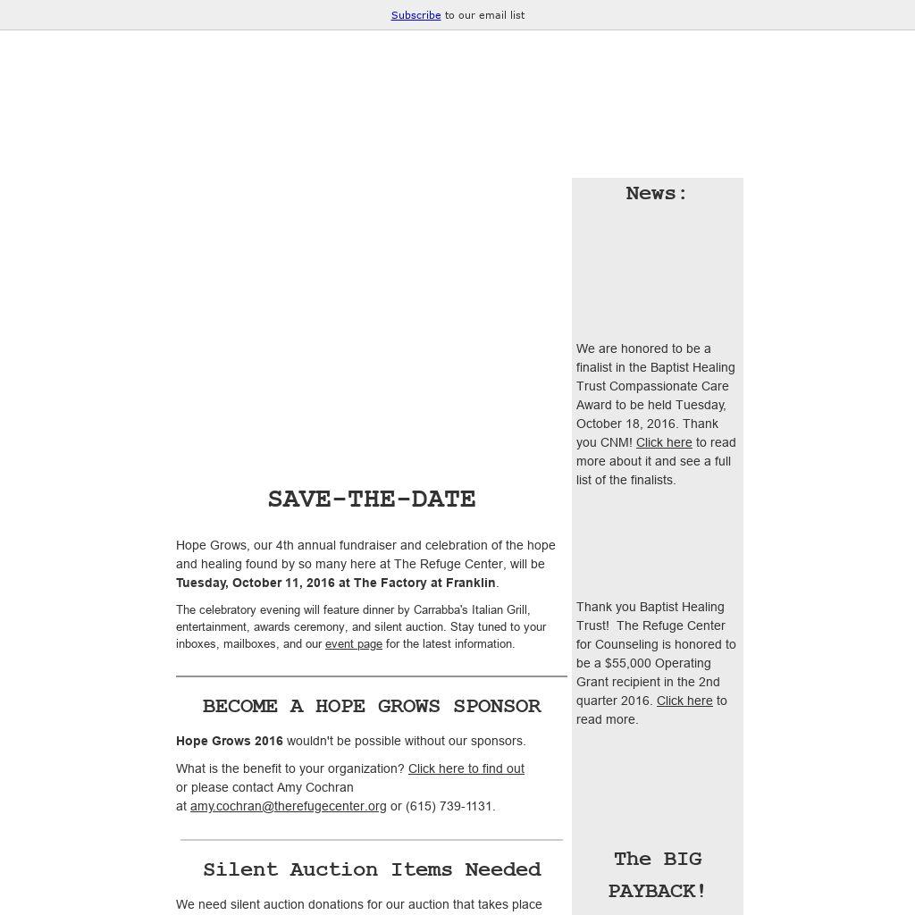 Hope Grows, our 4th annual fundraiser and celebration of the hope and healing found by so many here at The Refuge Center, will be Tuesday, October 11, 2016 at The Factory at Franklin.