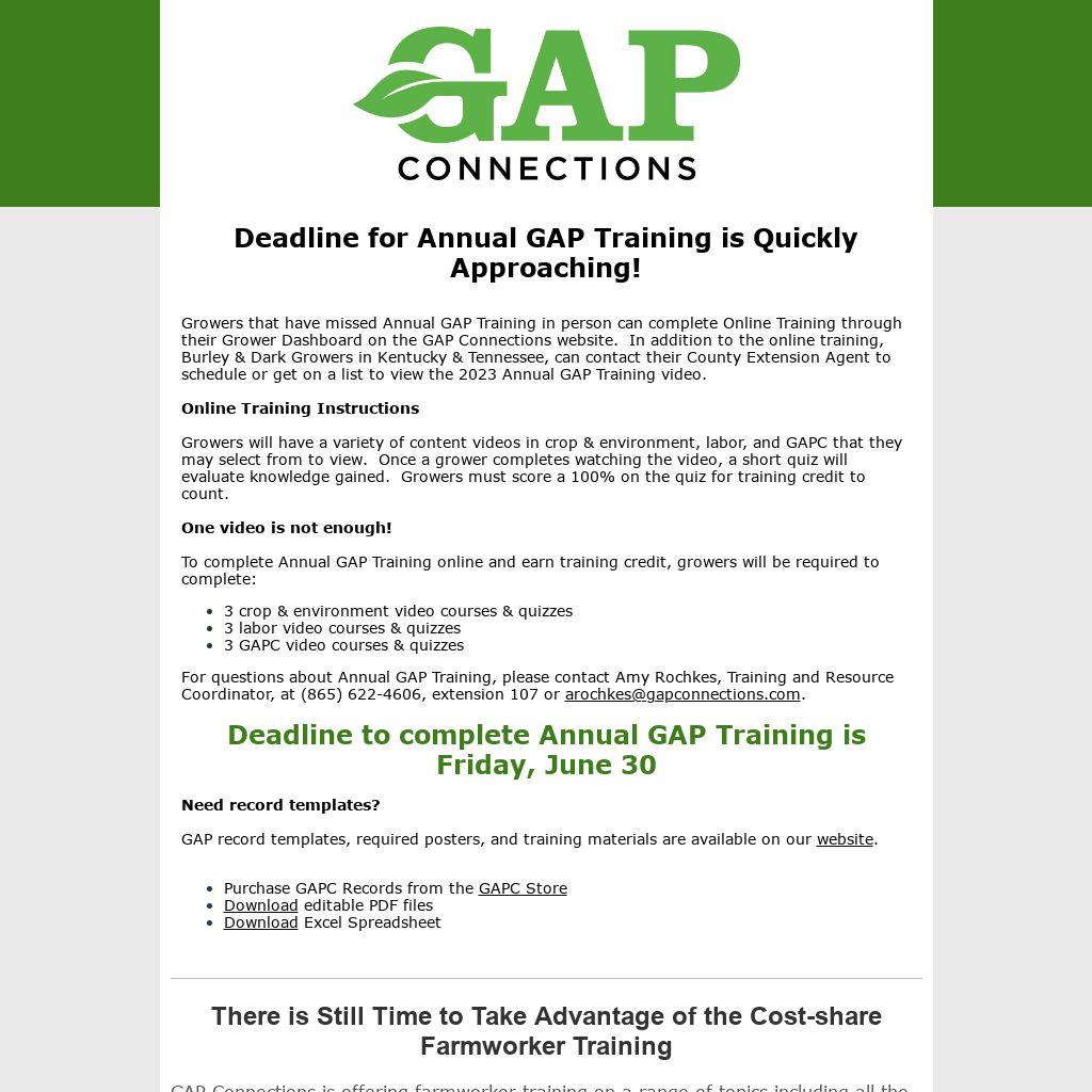 Growers that have missed Annual GAP Training in person can complete Online Training through their Grower Dashboard on the GAP Connections website. In addition to the online training, Burley & Dark Growers in Kentucky & Tennessee, can contact their County Extension Agent to schedule or get on a list to view the 2023 Annual GAP Training video.