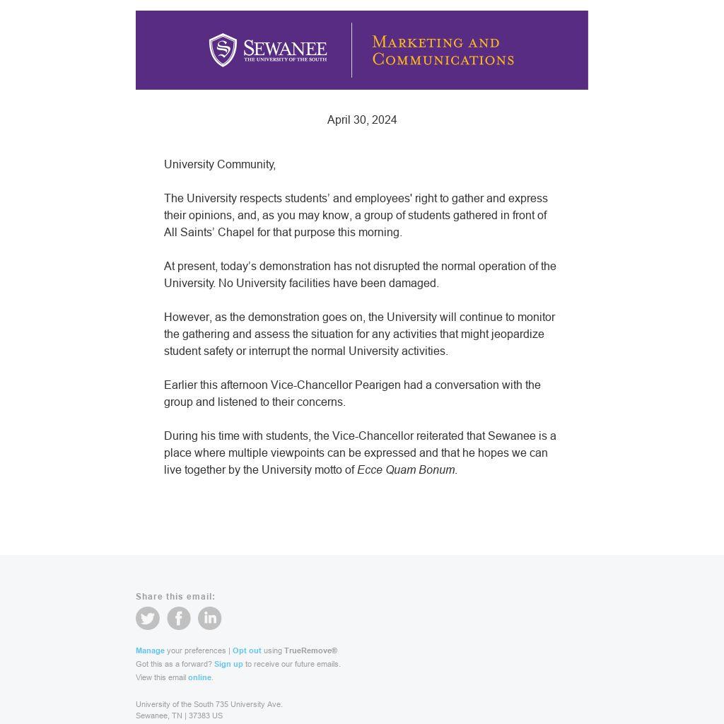 The University respects students’ and employees' right to gather and express their opinions, and, as you may know, a group of students gathered in front of All Saints’ Chapel for that purpose this morning.