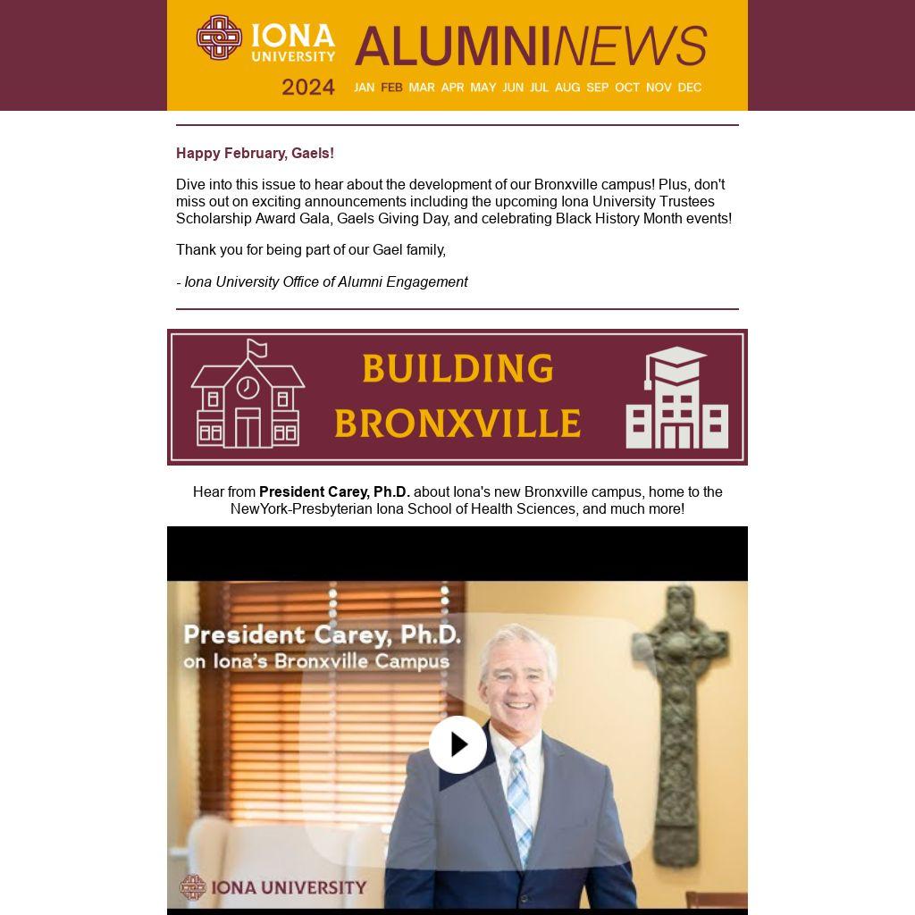 Dive into this issue to hear about the development of our Bronxville campus! Plus, don't miss out on exciting announcements including the upcoming Iona University Trustees Scholarship Award Gala, Gaels Giving Day, and celebrating Black History Month events!