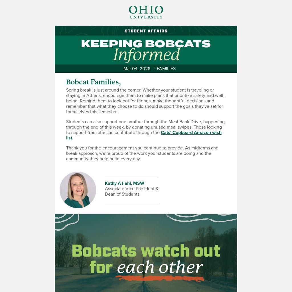 Spring break is just around the corner. Whether your student is traveling or staying in Athens, encourage them to make plans that prioritize safety and well-being. Remind them to look out for friends, make thoughtful decisions and remember that what they choose to do should support the goals they've set for themselves this semester.