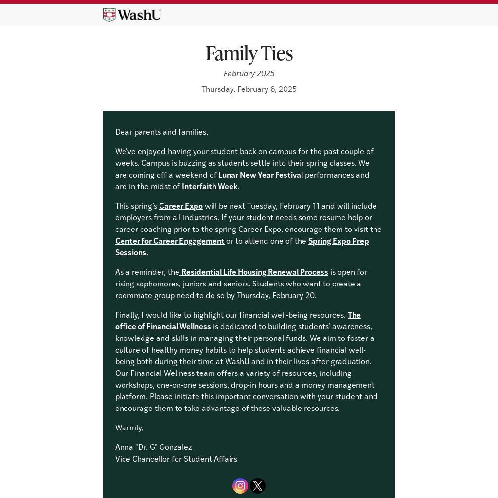 Finally, I would like to highlight our financial well-being resources. The office of Financial Wellness is dedicated to building students’ awareness, knowledge and skills in managing their personal funds. We aim to foster a culture of healthy money habits to help students achieve financial well-being both during their time at WashU and in their lives after graduation. Our Financial Wellness team offers a variety of resources, including workshops, one-on-one sessions, drop-in hours and a money management platform. Please initiate this important conversation with your student and encourage them to take advantage of these valuable resources.