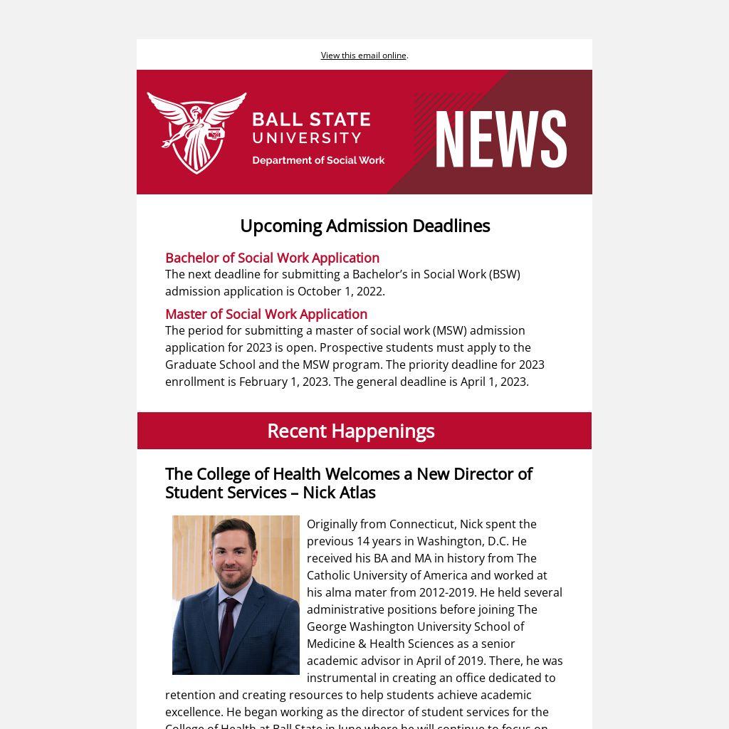 Bachelor of Social Work program. The Department of Social Work will launch the new BSW Online program in the Spring of 2023. We are excited to provide an accessible program option to adult learners. This will also allow individuals from across the globe to earn a degree online from Ball State University. We would like to thank the Division of Online and Strategic Learning for their ongoing support of these efforts. Learn more.