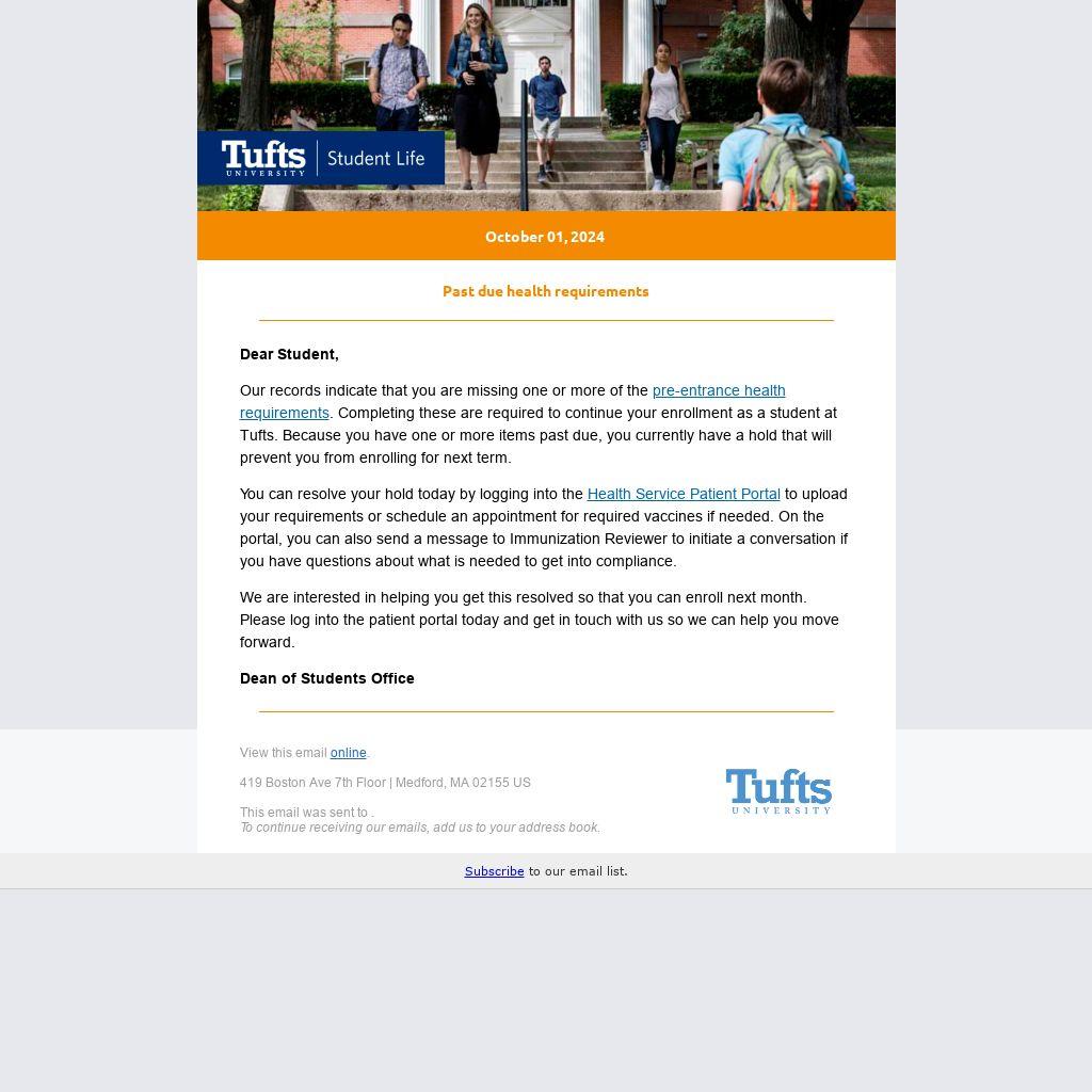 Our records indicate that you are missing one or more of the pre-entrance health requirements. Completing these are required to continue your enrollment as a student at Tufts. Because you have one or more items past due, you currently have a hold that will prevent you from enrolling for next term.