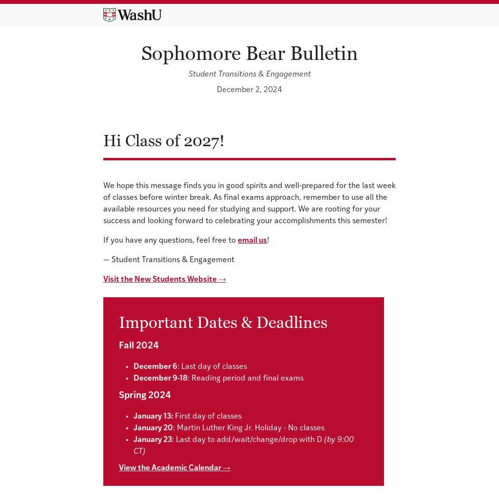 We hope this message finds you in good spirits and well-prepared for the last week of classes before winter break. As final exams approach, remember to use all the available resources you need for studying and support. We are rooting for your success and looking forward to celebrating your accomplishments this semester!