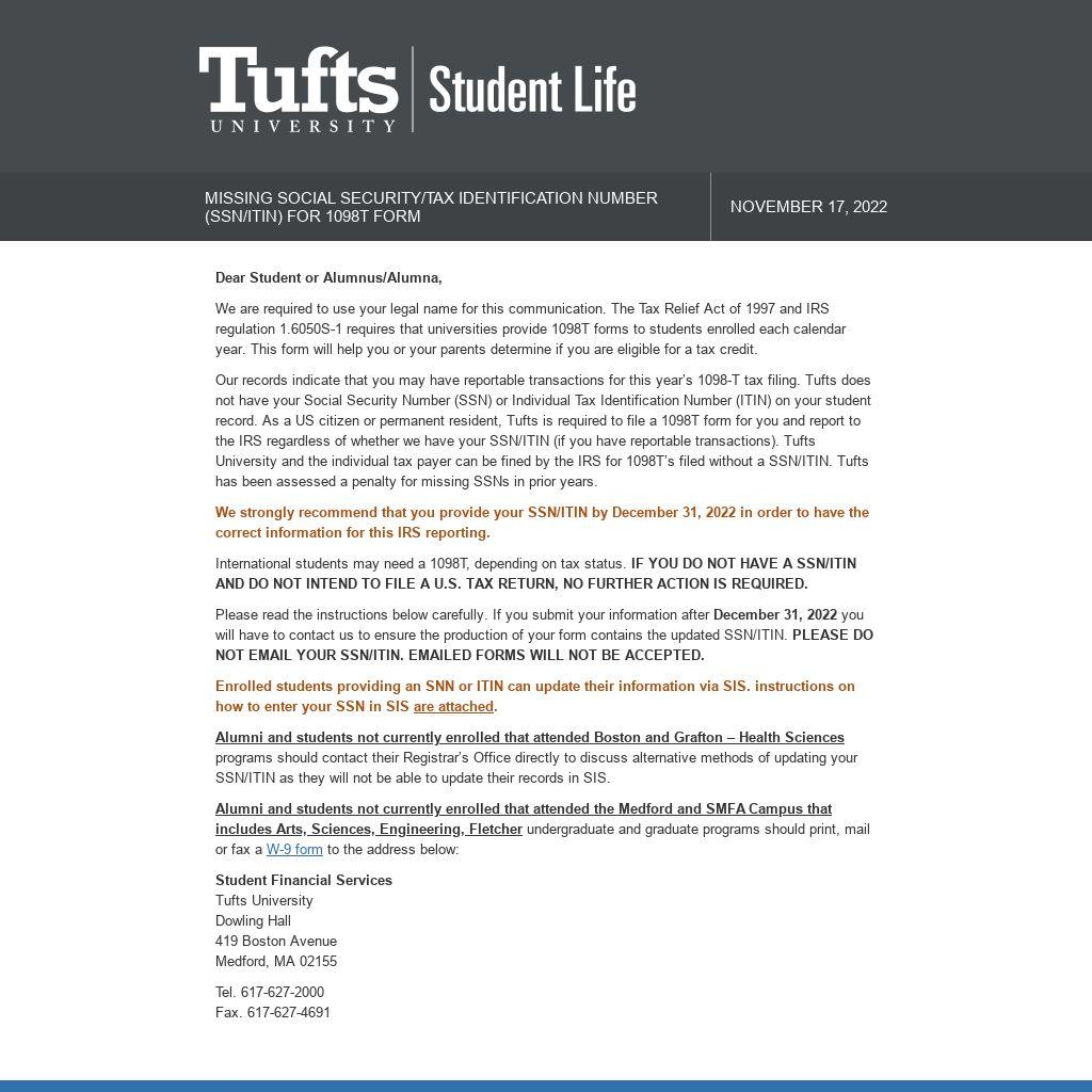 Our records indicate that you may have reportable transactions for this year’s 1098-T tax filing. Tufts does not have your Social Security Number (SSN) or Individual Tax Identification Number (ITIN) on your student record. As a US citizen or permanent resident, Tufts is required to file a 1098T form for you and report to the IRS regardless of whether we have your SSN/ITIN (if you have reportable transactions). Tufts University and the individual tax payer can be fined by the IRS for 1098T’s filed without a SSN/ITIN. Tufts has been assessed a penalty for missing SSNs in prior years.