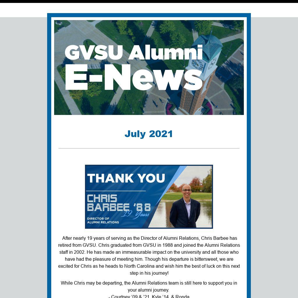 After nearly 19 years of serving as the Director of Alumni Relations, Chris Barbee has retired from GVSU. Chris graduated from GVSU in 1988 and joined the Alumni Relations staff in 2002. He has made an immeasurable impact on the university and all those who have had the pleasure of meeting him. Though his departure is bittersweet, we are excited for Chris as he heads to North Carolina and wish him the best of luck on this next step in his journey!