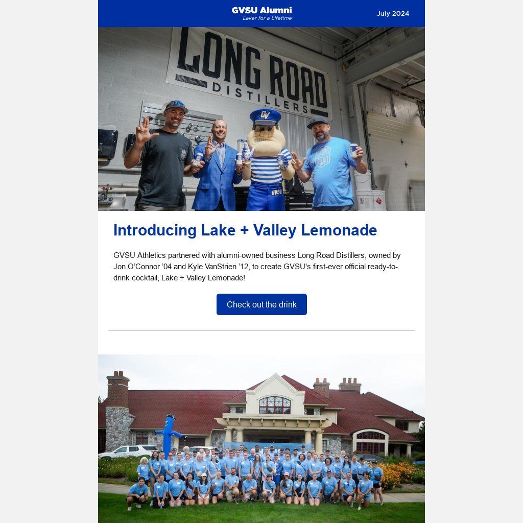 GVSU Athletics partnered with alumni-owned business Long Road Distillers, owned by Jon O’Connor ’04 and Kyle VanStrien ’12, to create GVSU's first-ever official ready-to-drink cocktail, Lake + Valley Lemonade!