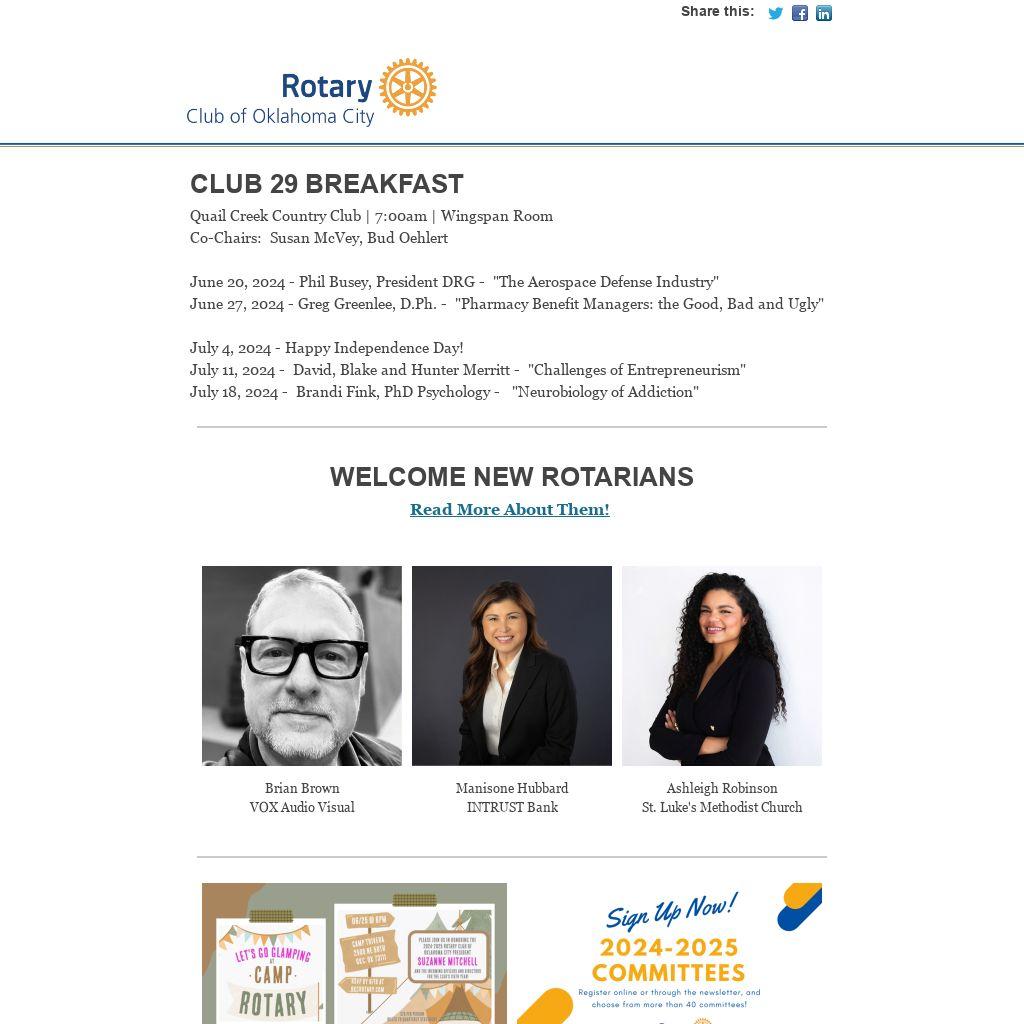 Amber Shelton who co-chaired the High School Rotarians and helped kick off the year by serving as Chair of the Inaugural Committee; Alex Kaiser for his outstanding work leading our New Member Recruitment Committee; Evan Walter for his dedicated service at our Registration Table every week this year; Jake Krattiger for his hard work these past two years developing and implementing a vision for our domestic service committee; Paul Moore for his efforts in leading and growing our invocation committee; Heather Lunsford for coordinating our many wonderful AfterHours gatherings; Kathryn Wilson Wheeler for planning one of our Club’s best Winter Party’s; Susan McVey, Bud Oehlert for their leadership at the Thursday breakfast meetings; and Keith Oehlert for her dedication to our international exchange programs including Open World and Wings of Rotary.