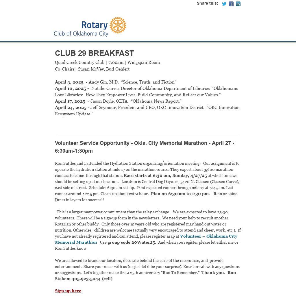 Ron Suttles and I attended the Hydration Station organizing/orientation meeting.   Our assignment is to operate the hydration station at mile 17 on the marathon course. They expect about 3,600 marathon runners to come  through that station. Race starts at 6:30 am, Sunday, 4/27/25 at which time we should be setting up at our location.   Location is Central Dog Daycare, 5420 N. Classen (Classen Curve), east side of street.  Schedule: 6:30 am set-up.  First expected runner through mile 17 at  7:45 am. Last runner around  12:15 pm. Clean-up about extra hour.  Plan on 6:30 am to 1:30 pm.    Rain or shine. Dress in layers for success!!