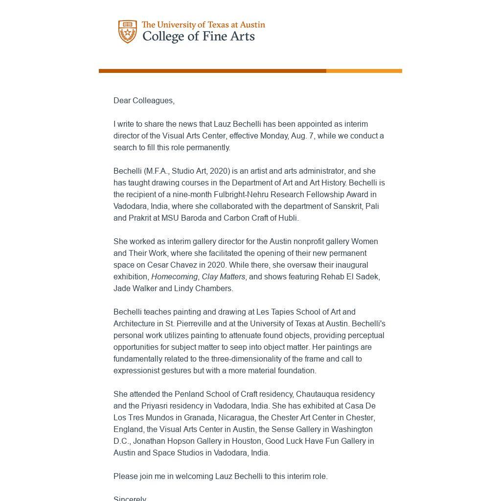 I write to share the news that Lauz Bechelli has been appointed as interim director of the Visual Arts Center, effective Monday, Aug. 7, while we conduct a search to fill this role permanently.