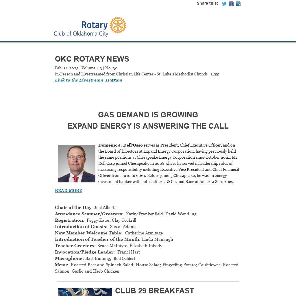 OKC Rotary NewsFeb. 11, 2025| Volume 113 | No. 30 In-Person and Livestreamed from Christian Life Center - St. Luke's Methodist Church | 11:55
