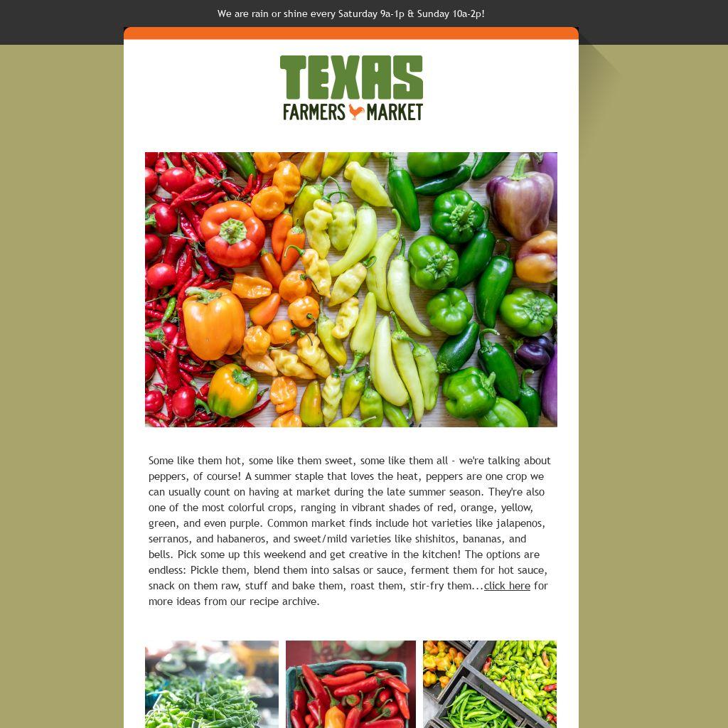 Basil (lemon, Thai) * Beans (dragon tongue, Chinese long, yellow pole, green, tricolor) * Beets (golden, red) * Carrots * Chard * Cucumber (Armenian, slicing, pickling) * Eggplants (black beauty, purple, graffiti) * Garlic * Leeks * Lemongrass * Melons (watermelon, cantaloupe, honeydew, Korean) * Mint * Okra * Onions (yellow, white, red, 1015) * Parsley * Peas * Peaches * Peppers (sweet, bell, sweet Hungarian wax, jalapeno, banana) * Potatoes (Yukon gold, red) * Rosemary * Shallots * Squash (blossoms, butternut, acorn, spaghetti, delicata, yellow, zucchini, pattypan) * Sweet potato greens * Sweet corn * Thyme * Tomatillos * Tomatoes (cherry, Roma, grape, heirloom)