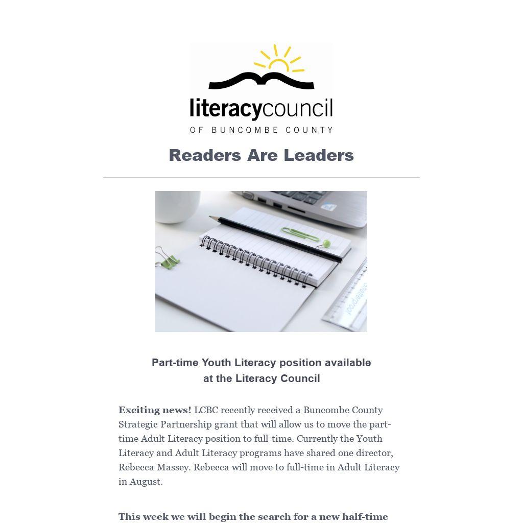 Exciting news! LCBC recently received a Buncombe County Strategic Partnership grant that will allow us to move the part-time Adult Literacy position to full-time. Currently the Youth Literacy and Adult Literacy programs have shared one director, Rebecca Massey. Rebecca will move to full-time in Adult Literacy in August.