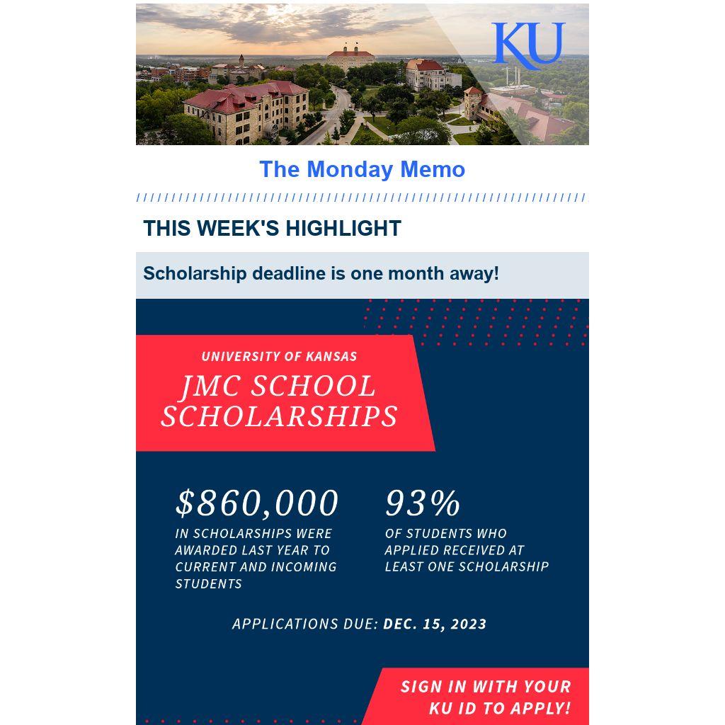 Apply here (Click the red Sign In button at the top, then log in with your KU online ID and password). You may be asked to complete a general questionnaire before moving to the School of Journalism and Mass Communications Undergraduate Scholarship Application.
