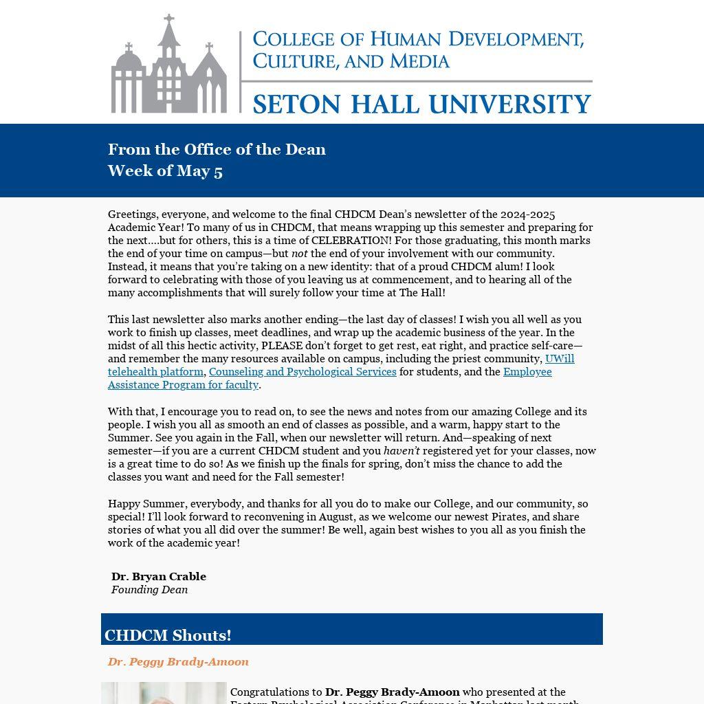 Greetings, everyone, and welcome to the final CHDCM Dean’s newsletter of the 2024-2025 Academic Year! To many of us in CHDCM, that means wrapping up this semester and preparing for the next….but for others, this is a time of CELEBRATION! For those graduating, this month marks the end of your time on campus—but not the end of your involvement with our community. Instead, it means that you’re taking on a new identity: that of a proud CHDCM alum! I look forward to celebrating with those of you leaving us at commencement, and to hearing all of the many accomplishments that will surely follow your time at The Hall!