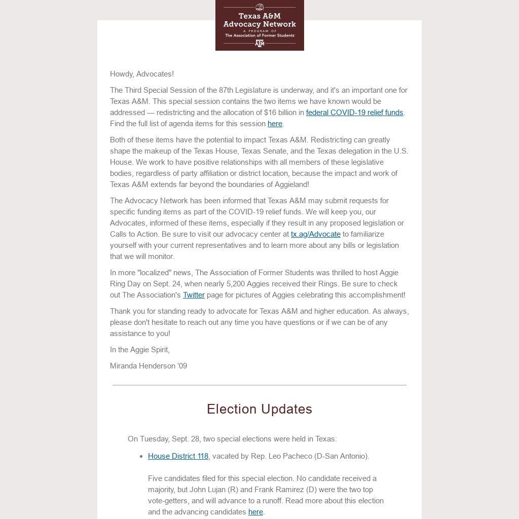 The election of Harrison in HD-10 will give us a new Aggie in the Texas Legislature — whoop! We are excited to welcome him and look forward to working with him for the betterment of Texas A&M.