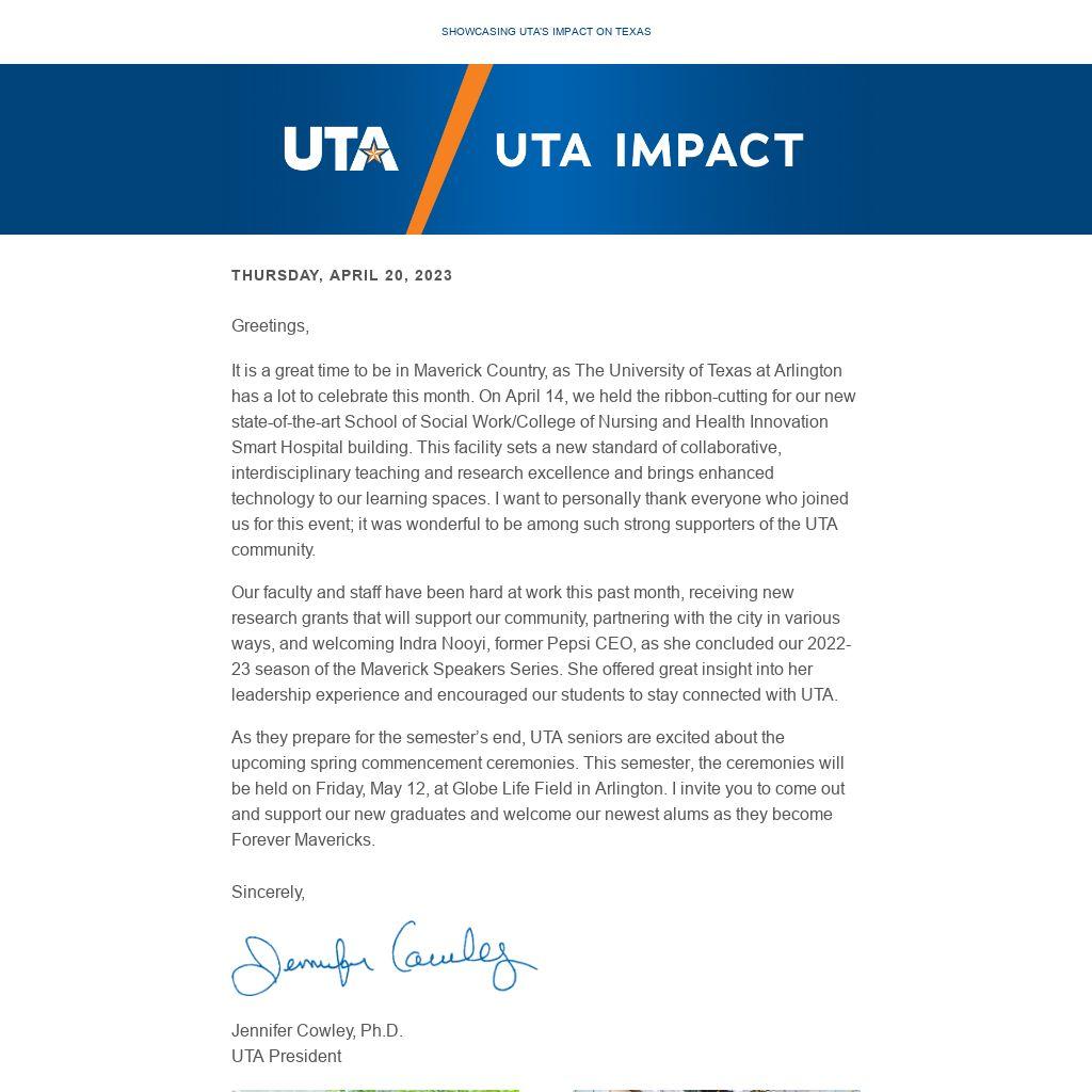 As they prepare for the semester’s end, UTA seniors are excited about the upcoming spring commencement ceremonies. This semester, the ceremonies will be held on Friday, May 12, at Globe Life Field in Arlington. I invite you to come out and support our new graduates and welcome our newest alums as they become Forever Mavericks.