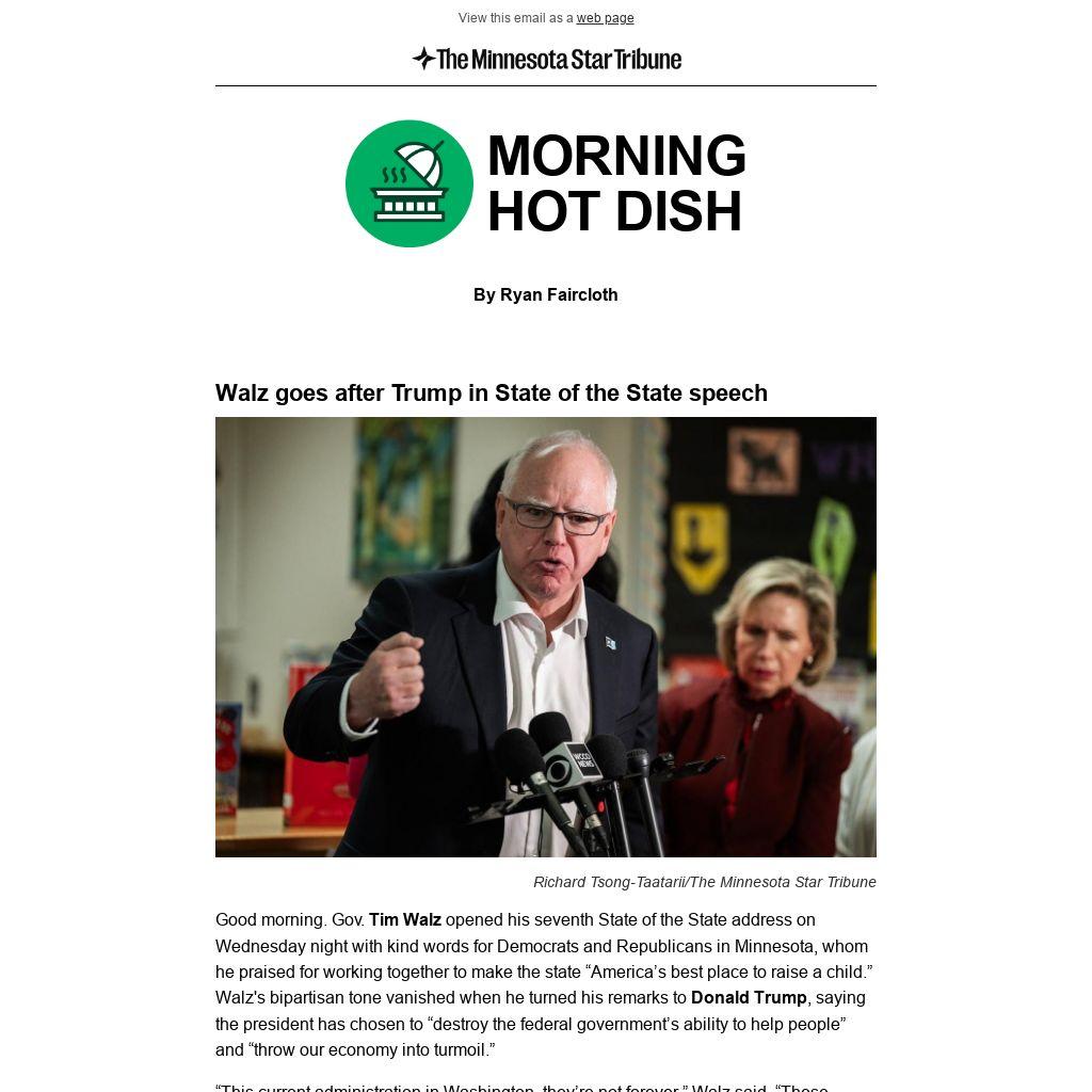 Good morning. Gov. Tim Walz opened his seventh State of the State address on Wednesday night with kind words for Democrats and Republicans in Minnesota, whom he praised for working together to make the state “America’s best place to raise a child.” Walz's bipartisan tone vanished when he turned his remarks to Donald Trump, saying the president has chosen to “destroy the federal government’s ability to help people” and “throw our economy into turmoil.”