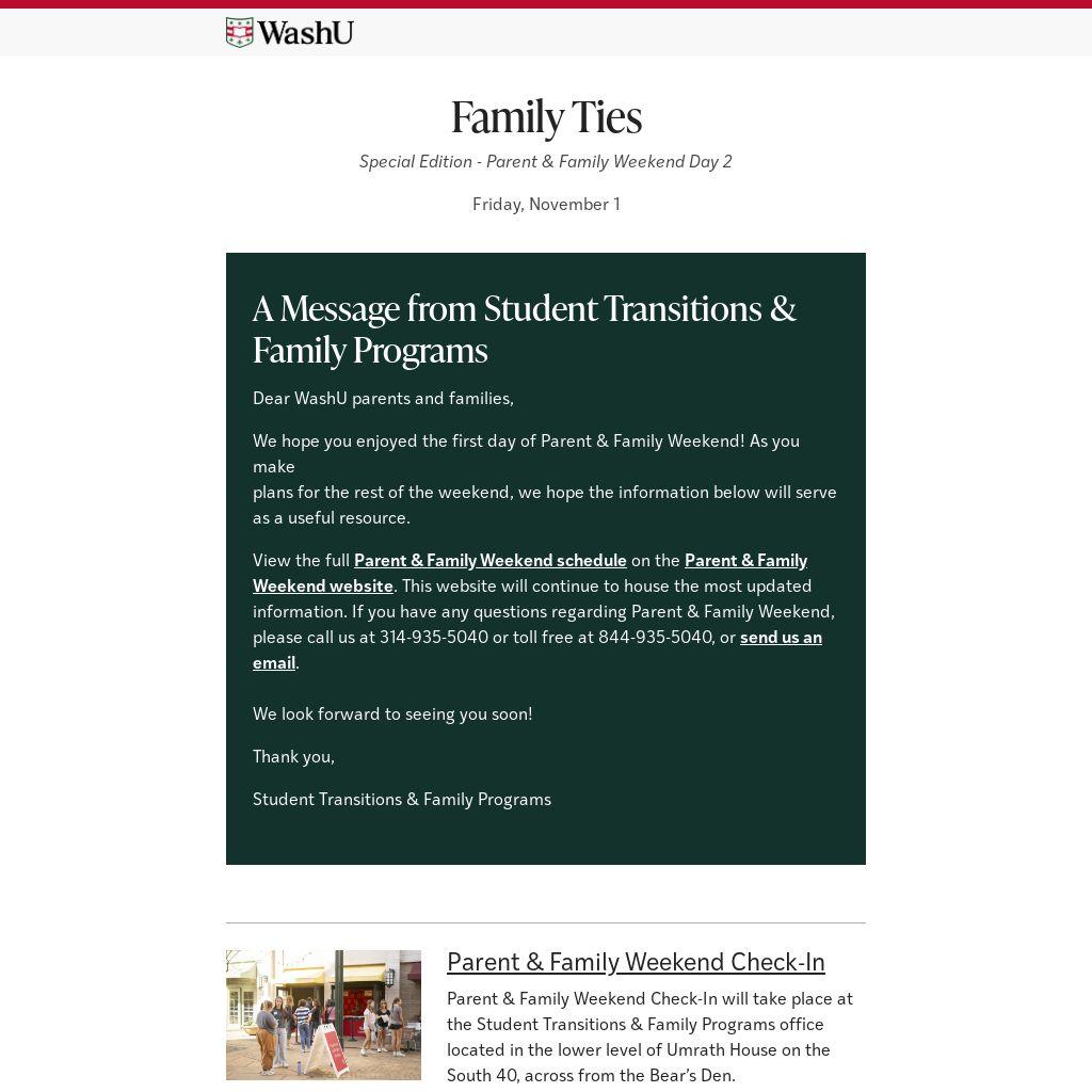 View the full Parent & Family Weekend schedule on the Parent & Family Weekend website. This website will continue to house the most updated information. If you have any questions regarding Parent & Family Weekend, please call us at 314-935-5040 or toll free at 844-935-5040, or send us an email.
