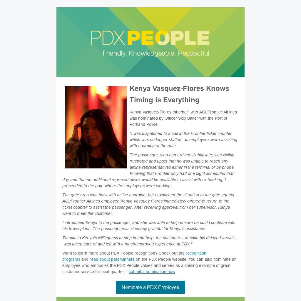 Thanks to Kenya’s willingness to step in and help, the customer – despite his delayed arrival – was taken care of and left with a much-improved experience at PDX."